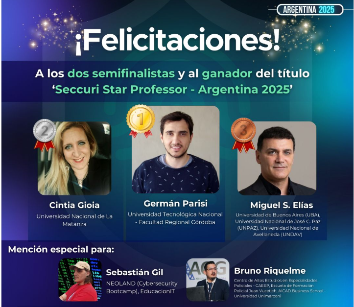 El Esp. Ing. Germán Parisi, docente de nuestra Facultad, fue distinguido como “Seccuri Star Professor – Argentina 2025”. La empresa Seccuri organiza cada año el evento internacional “Seccuri Awards”, que busca visibilizar y reconocer la tarea de docentes que forman profesionales en el área de ciberseguridad. Este año, la edición se realizó por primera vez en Argentina, y Germán Parisi fue elegido como el Mejor Profesor de Ciberseguridad entre 60 nominados de todo el país.