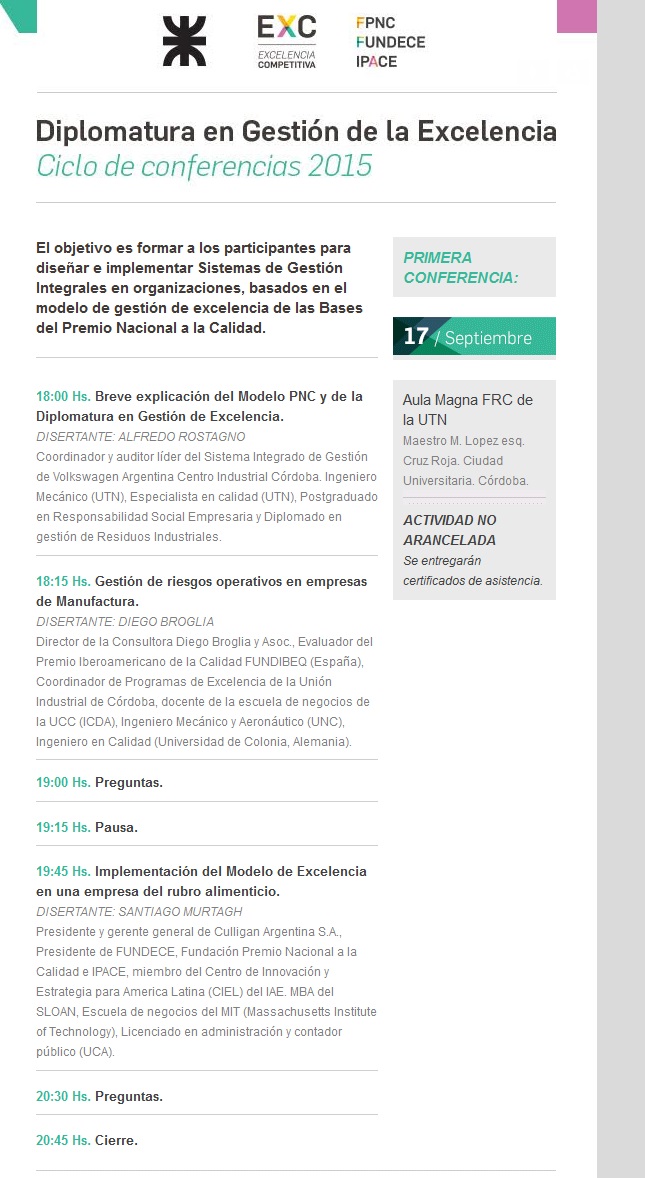 Ciclo de Conferencias 2015 Gestión de la Excelencia El día jueves 17 de septiembre a las 18 hs., en el Salón de Actos de nuestra Casa de Estudios, se desarrollará la Conferencia sobre “Gestión de la Excelencia”. Entre los disertantes contaremos, con la presencia del Presidente de FUNDECE Santiago Murtagh, quien expondrá sobre Implementación del Modelo de Excelencia en una empresa del rubro alimenticio. Esta actividad se enmarca dentro del Ciclo de Conferencias previsto conjuntamente por esta Facultad y la red de interacción de la Excelencia Competitiva EXC (Fundece, IPACE y Fundación Premio Nacional a la Calidad), con el objetivo de promocionar la Diplomatura en Gestión de la Excelencia que lanzarán a partir de la primera semana de abril de 2016.