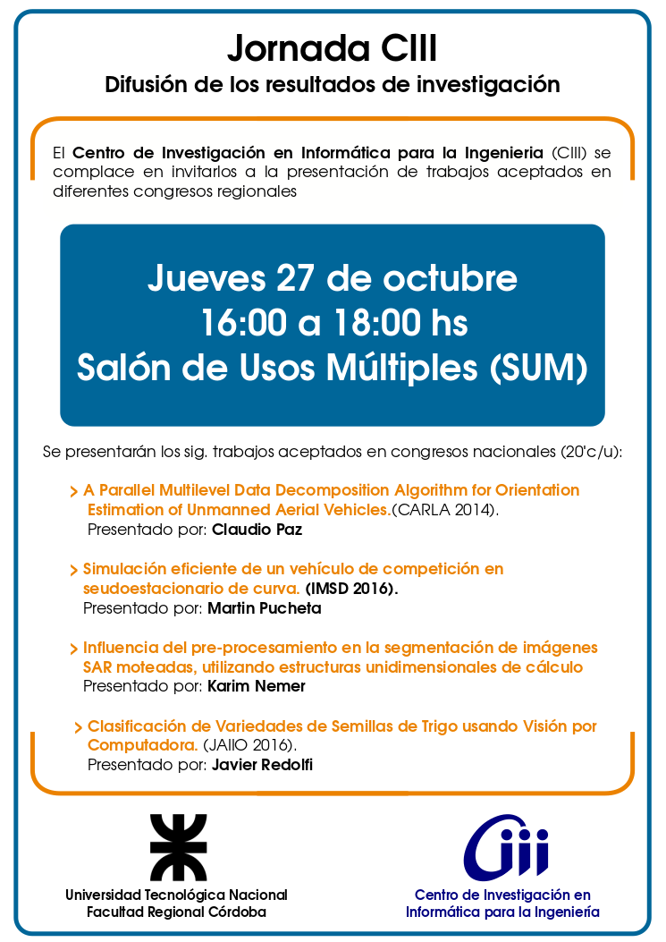 Informes e Inscripción: CIII Jornada de Difusión de Resultados de Investigación El día jueves 27 de octubre a partir de las 16 hs., en la Sala de Usos Múltiples (SUM) de nuestra Facultad, se realizará una Jornada de Difusión de los Resultados de Investigación del Centro de Investigación en Informática para la Ingeniería (CIII). En la misma, se expondrán aquellos trabajos aceptados para diversos congresos regionales. La entrada es libre y gratuita, sin inscripción previa. Más Información 2º Acto Académico 19° Entrega de Diplomas de Técnicos Superiores
