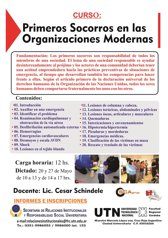 Informes e inscripción: Secretaría de Relaciones Institucionales y RSU Primeros Socorros en las Organizaciones Modernas Se encuentran abiertas las inscripciones para realizar el curso sobre “Primeros Socorros en las Organizaciones Modernas”, que se desarrollará los días 20 y 27 de mayo de 10 a 13 y de 14 a 17 hs., en las instalaciones de la Facultad. El mismo es dictado por el Lic. Cesar Schindele y tendrá una carga horaria de 12 hs. Organiza la Secretaría de Relaciones Institucionales y Responsabilidad Social Universitaria y SCAgrup. Más Información