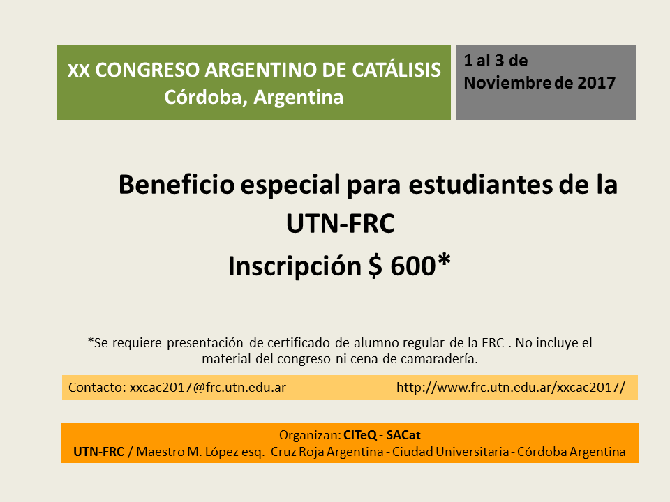Del 1 al 3 de noviembre se realizará, en esta Facultad, el “XX Congreso Argentino de Catálisis” (XX CAC). Este Congreso es organizado por el Centro de Investigación y Tecnología Química “Prof. Dr. Oscar A. Orio” (CITeQ, UTN-CONICET) y la Sociedad Argentina de Catálisis (SACat). Además, los días 30 y 31 de octubre, se realizará una nueva edición de la Escuela Argentina de Catálisis (EAC 2017) que marca la importancia en la formación de recursos humanos, uno de los objetivos fundamentales de esta actividad científica. En esta oportunidad tratará sobre Revalorización de Biomasa para la obtención de Químicos Finos y Energía. Más información - Beneficio a estudiantes de la Facultad