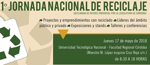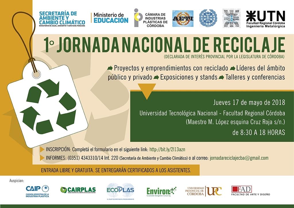 El jueves 17 de mayo de 8:30 a 18 hs., en diversos ámbitos nuestra Facultad, se desarrollará la “1° Jornada Nacional de Reciclaje”. El objetivo de la misma es valorar la importancia de la reutilización y el reciclado de productos plásticos con el fin de minimizar los impactos negativos ambientales. Organiza el Departamento de Ingeniería Metalúrgica de esta Casa de Estudios, la Secretaría de Ambiente y Cambio Climático del Ministerio de Agua, Ambiente y Servicios Públicos; el Ministerio de Educación del Gobierno de la Provincia de Córdoba y la Cámara de Industrias Plásticas de Córdoba. Entrada libre y gratuita, con inscripción previa. Programa