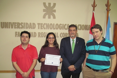 La Facultad entregó un Reconocimiento a la Excelencia a la estudiante de 5° año de la carrera de Ingeniería Química, Rocío Villagrán Vargas, por su destacada participación al representar a esta Casa de Estudios en distintas Becas Internacionales. Participaron de la entrega el Decano, Ing. Rubén Soro y el Secretario de Asuntos Estudiantiles, Sr. Juan Saavedra. Cabe destacar que dicha estudiante viajará nuevamente representando a la Facultad, con una beca del GKS for African and Latin American Undergraduate Students del Ministerio de Educación de Corea del Sur, para tomar un curso de cinco semanas junto a otros 20 becarios de Latinoamérica, sobre “Ciencia de los Materiales e Ingeniería” en la Universidad Nacional de Chonnam, Gwangju (Corea).
