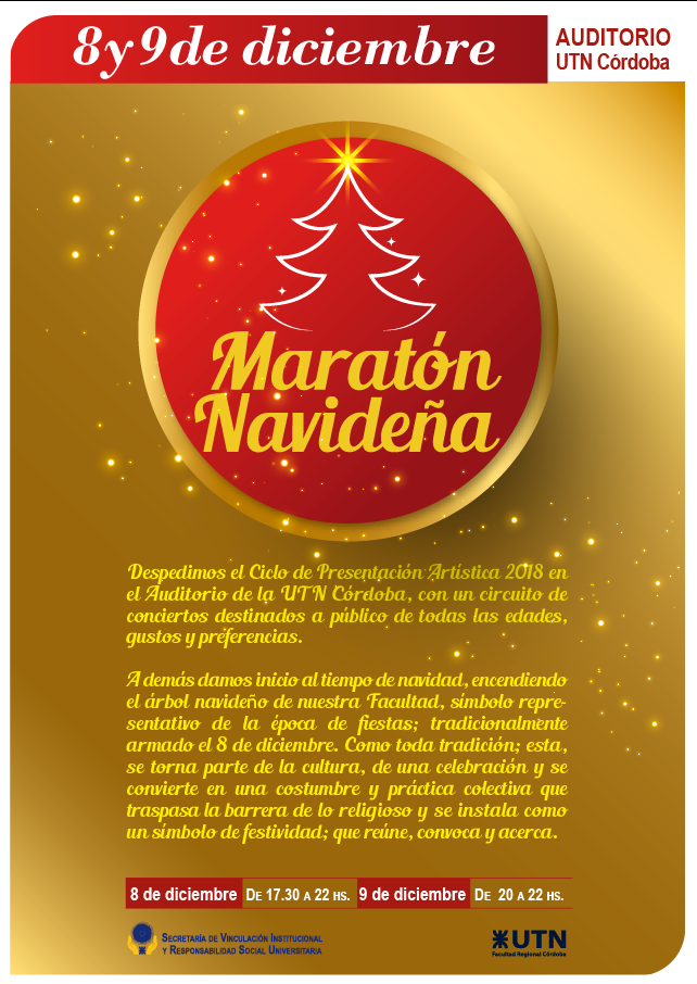Los días 8 y 9 de diciembre la Facultad realizará una “Maratón Navideña” donde se llevarán a cabo una serie de conciertos destinados a públicos de todas las edades; además se encenderá el Árbol Navideño. Organiza la Secretaría de Vinculación Institucional y Responsabilidad Social Universitaria. Más información
