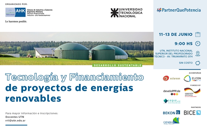 Del 11 al 13 de junio en la sede del Instituto Nacional Superior del Profesorado Técnico (INSPT) de la Universidad Tecnológica Nacional, (CABA); se realizará el Workshop: "Tecnología y Financiamiento de Proyectos de Energías Renovables – Enfoque BIOGAS". El mismo está dirigido a los Docentes de la nuestra Universidad, es gratuito con inscripción previa y se entregarán certificados de asistencia. En caso de no poder asistir los 3 días, se recomienda hacerlo el día 13. Disertación en inglés y español. Organizan la Secretaría de Relaciones Internacionales, con el apoyo de Secretaría Académica de Rectorado de la Universidad Tecnológica Nacional (UTN) y la Cámara de Industria y Comercio Argentino–Alemana (AHK). Más información e inscripciones