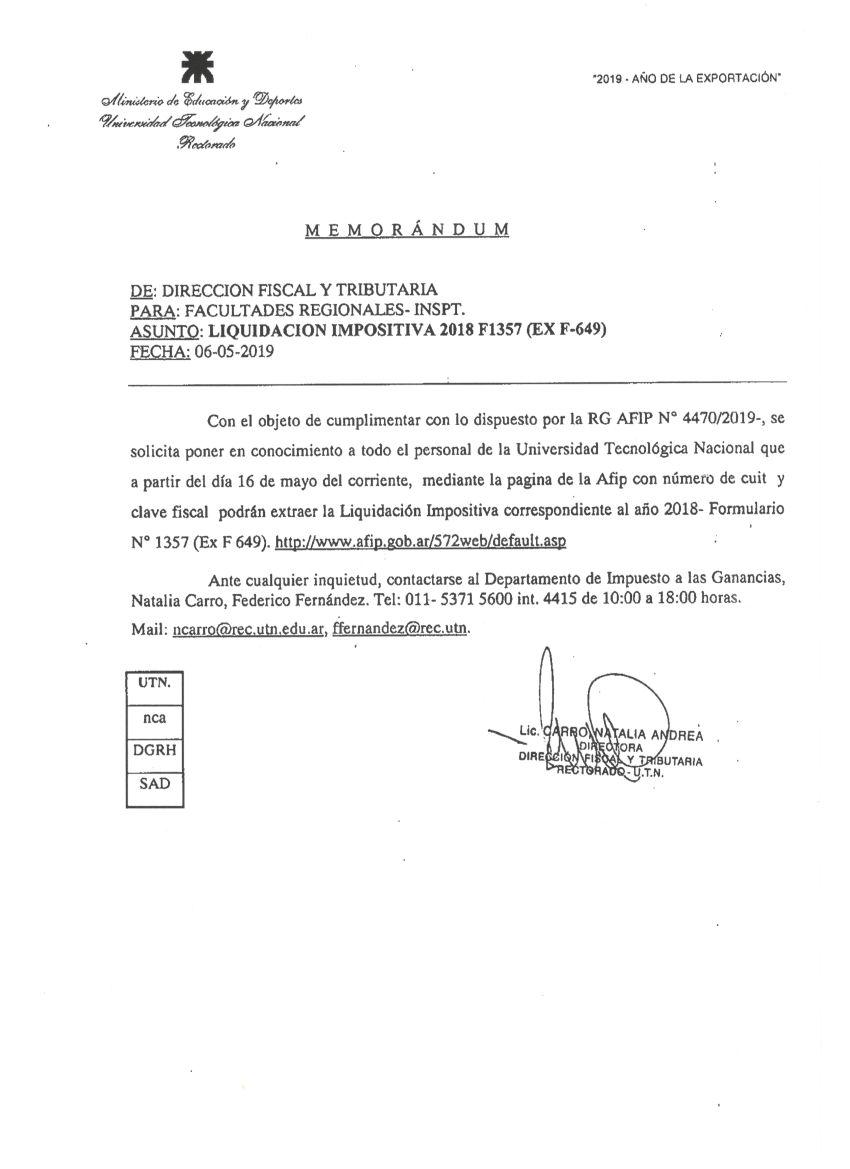 Informes e inscripción: DASUTeN – Delegación Regional Córdoba Cambios y suspensiones en algunas prestaciones El Consejo de Administración de DASUTeN informa a sus Afiliados que a partir del 1º de mayo de 2019 se modificaron y suspendieron algunas prestaciones relacionadas a Prácticas Odontológicas (Implantes y Ortodoncia), Bioquímicas, Kinesiológicas y de Psicoterapia. Para mayor información dirigirse a la Oficina de DASUTeN de lunes a viernes de 8 a 13 y de 14:30 a 19 hs. o comunicarse al teléfono: 0351-5986036. Memorándum Liquidación Impositiva F1357 (Ex F-649) Información de la Dirección General de RRHH para el Personal Docente y No Docente de la UTN VER MEMORÁNDUM - Liquidación Impositiva 2018 F1357 (Ex F-649) Secretaría de Vinculación Institucional y RSU Programa Festejo Sostenible