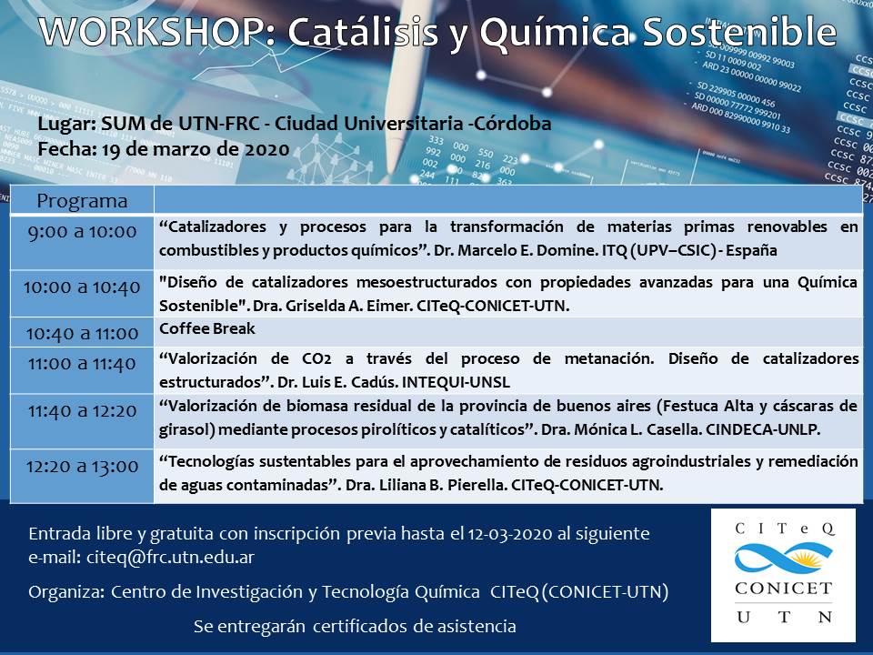 Informes e inscripción: Departamento de Ingeniería Electrónica Inauguración Nueva Aula/ Laboratorio de Comunicaciones El día miércoles 18 de marzo a las 20 hs., el Laboratorio de Comunicaciones inaugurará un nuevo espacio áulico que permitirá el dictado de clases teóricas y/o la realización de prácticas por parte de los alumnos de Ingeniería Electrónica. El mismo cuenta con nueva infraestructura financiada con fondos propios de la Facultad. Centro de Investigación y Tecnología Química - CITEQ Workshop: Catálisis y Química Sostenible