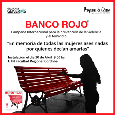 Grupo de Génerxs - UTN Córdoba Campaña Internacional para la prevención de la Violencia y Femicidio – BANCO ROJO El viernes 30 abril a las 9 hs., en el tradicional Patio del Estudiante de la Facultad, se instalará un BANCO ROJO, como parte de la Campaña internacional para la prevención de la violencia de género y los feminicidios. El banco rojo representa un emblema universal del lugar ocupado por una mujer que fue víctima de femicidio y pretende, como proyecto, lograr adhesiones y réplicas en todo el mundo para sensibilizar a los ciudadanos y particularmente a los más jóvenes.