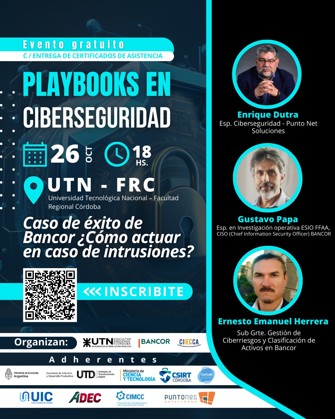 El Departamento de Ingeniería en Sistemas de Información invita a la Conferencia gratuita, abierta al público en general, sobre “Playbooks en Ciberseguridad”, que se realizará el día jueves 26 de octubre de 18 a 20 hs., en el Auditorio de nuestra Facultad. Allí se explorarán las mejores estrategias y prácticas para proteger sistemas y datos de amenazas cibernéticas y expertos contestarán preguntas del público. Se entregarán certificados de asistencia. – Más información e inscripciones