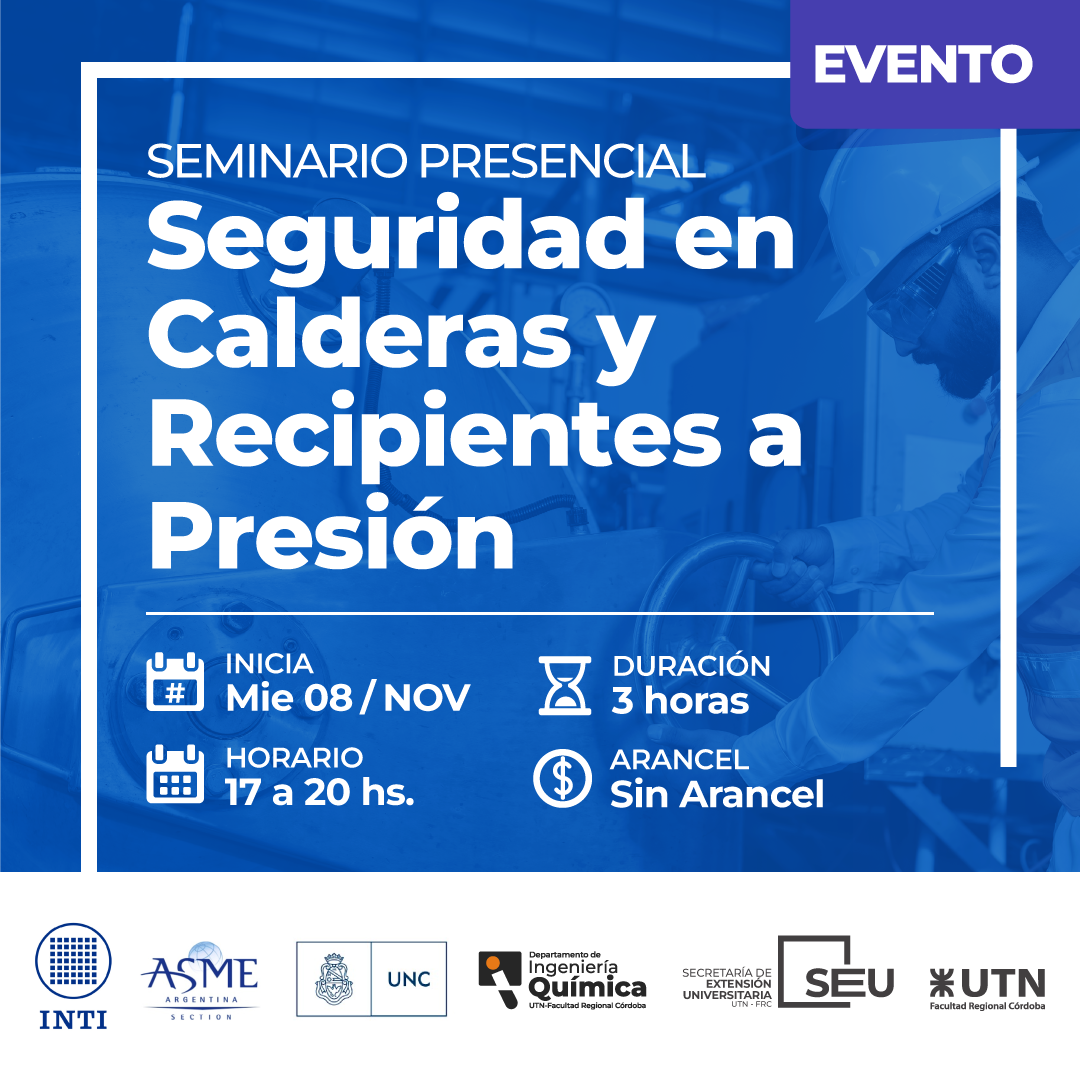 El miércoles 8 de noviembre, de 17 a 20 hs. en la Sala Agustín Tosco de nuestra Facultad, se desarrollará el Seminario “Seguridad en calderas y recipientes a presión”. En este encuentro se abordará la temática desde el punto de vista de distintos profesionales que componen los comités en la Junta Nacional de Calderas y Recipientes a Presión. Además, se llevará a cabo una Muestra Dinámica a cargo de becarios, alumnos, egresados y docentes de nuestra Facultad, del FAMAF y de la Facultad de Ciencias Exactas, Físicas y Naturales (UNC). Formulario de Inscripción – Más información