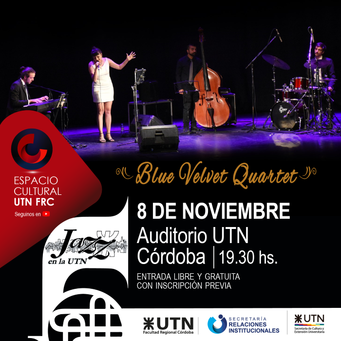 El miércoles 8 de noviembre, a las 19:30 hs. en el Auditorio de nuestra Facultad, el conjunto de jazz Blue Velvet Quartet (BVQ) brindará al público reinterpretaciones y canciones del American songbook. El cuarteto, formado en 2014, está integrado por la vocalista Cordelia Andrada, el pianista Agustín Waldheim, el contrabajista Lucas Sánchez y el baterista Lucio Cheli. La velada se verá animada, además, con el baile de Swing City. La presentación se enmarca dentro del Ciclo Cultural UTN FRC y la entrada es libre y gratuita, con inscripción previa. - Más información