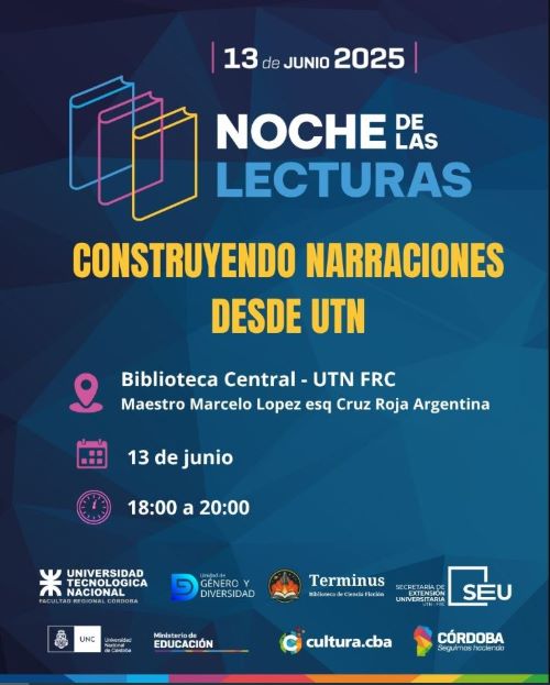 El viernes 13 de junio, en el marco del evento "Noche de las Lecturas”, se desarrollarán en la Biblioteca Central de nuestra Facultad dos actividades. Bajo la propuesta “Construyendo narrativas desde la UTN”, a las 18 hs., tendrá lugar “Representaciones de género en la ficción” con Cezary Novek y María Fornero,un encuentro para compartir lecturas con escritores y escritoras cordobesas y conversar sobre las huellas de género en diversos textos de ficción. Luego, a las 19 hs., “Un paseo por Términus” propone un recorrido por el catálogo de la sección de Ciencia Ficción, recientemente inaugurada en nuestra Biblioteca, y sus proyectos literarios abiertos a la comunidad.