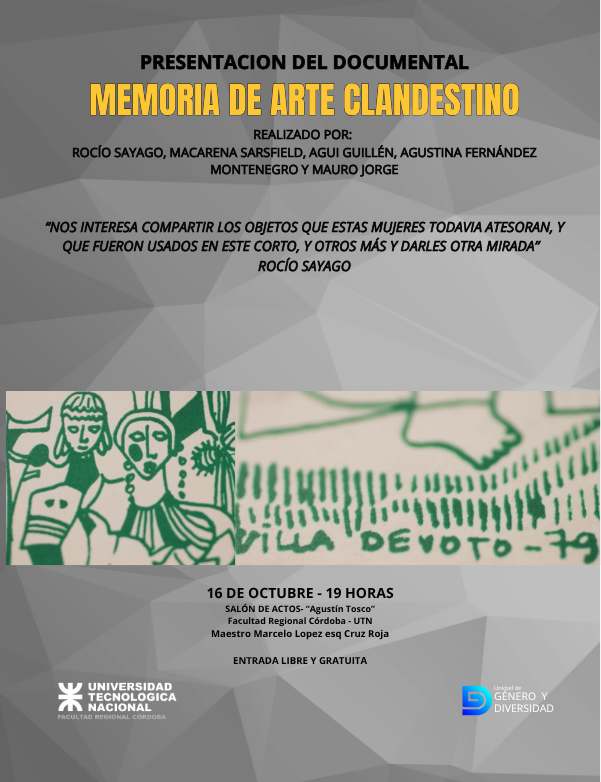 En el marco del Ciclo Resonancias Diversas, que reúne a diferentes expresiones, letras comprometidas e imágenes disruptivas de la cultura local y nacional, la Unidad de Género y Diversidad de nuestra Facultad organiza la proyección del documental “Memoria de Arte Clandestino” y una charla abierta con quienes lo crearon. La pieza cinematográfica constituye un recorrido por las voces y los objetos rescatados y resguardados de mujeres presas en la cárcel de Devoto durante la dictadura militar. El encuentro será el jueves 16 de octubre a las 19 hs., en la Sala Agustín Tosco de esta Casa de Estudios; con entrada libre y gratuita.