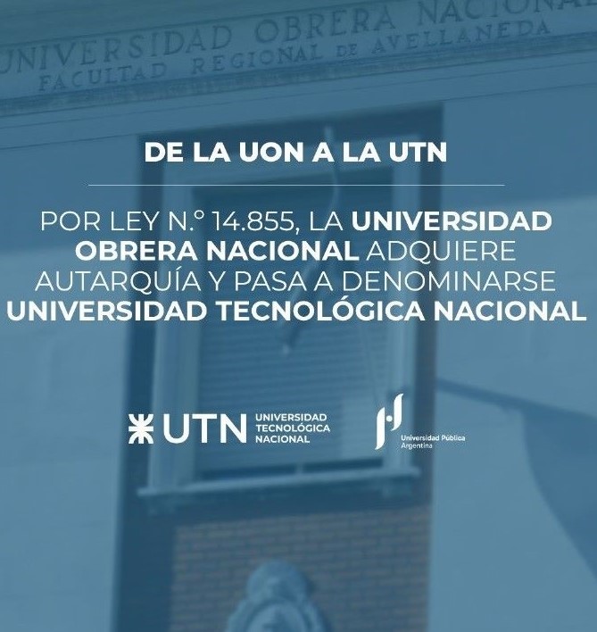 El 14 de octubre de 1959, la Universidad Obrera Nacional (UON) pasa a denominarse oficialmente Universidad Tecnológica Nacional (UTN), a través de la sanción de la Ley 14.855, que establece en su artículo primero que la Universidad Obrera Nacional, creada por el artículo 9° de la Ley 13.229 como organismo dependiente de la Comisión Nacional de Aprendizaje y Orientación Profesional, quedaba separada desde la fecha de tal vinculación y entraría a funcionar dentro del régimen jurídico de autarquía con el nombre de Universidad Tecnológica Nacional. Desde sus orígenes y con fuerte presencia federal, la Universidad Tecnológica Nacional sigue adelante con su misión de formar profesionales de la Ingeniería del más alto nivel y contribuir al desarrollo de la investigación y de la ciencia para el progreso de nuestro país.