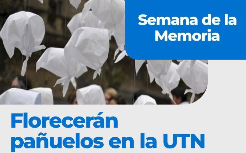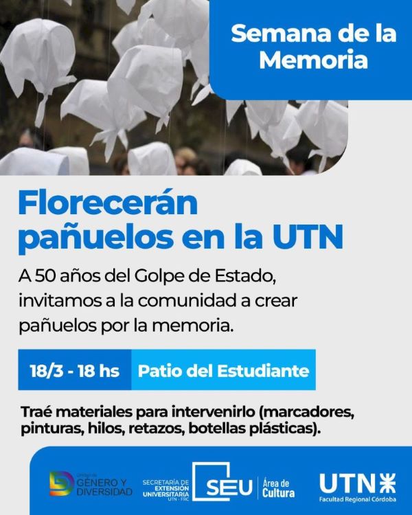 Como antesala a las actividades que llevará adelante nuestra Facultad durante la Semana de la Memoria, HOY miércoles 18 de marzo a las 18 hs., en el Patio del Estudiante, se desarrollará la Jornada "Florecerán pañuelos en la UTN", un evento que invita a la creación colectiva de pañuelos. Las personas interesadas pueden concurrir con materiales para intervenir los pañuelos, como marcadores, pinturas, retazos y demás. La invitación está abierta a la comunidad que quiera participar de esta jornada para mantener viva la memoria, a 50 años del Golpe de Estado. Agenda de actividades culturales, académicas y de reflexión de la "Semana de la Memoria" del 25 al 27 de marzo